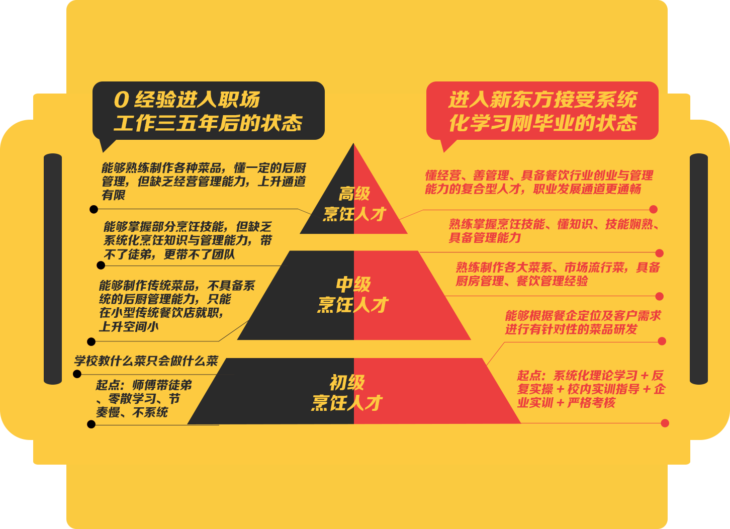 新东方办学长达34年,是中国烹饪教育的黄埔军校,往期 毕业的学员早已走上企业核心管理岗位,有不少学生自己创 业开公司,这些资源也成为现在的学生毕业后就业的重要优 势,这都是一般学校无法比拟的。